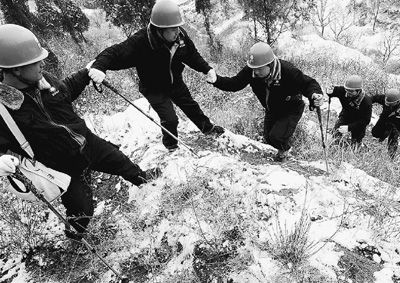 漫天飛舞的雪花覆蓋了崎嶇的山路,讓上山變得更加困難。班長唐宏走在前面,為大家探路,他說:“雪中登山,摔跤是家常便飯。”