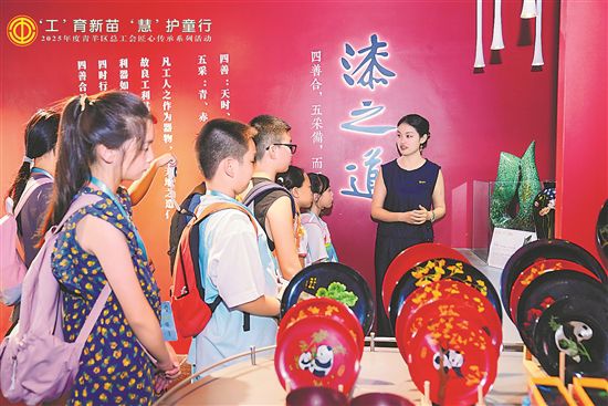 7月29日,四川省成都市漆器工藝廠迎來“萌娃”探訪。孩子們在非遺傳承人的帶領下,參觀並了解漆器工藝,感受漆器魅力。據悉,成都市青羊區總工會以“‘工’育新苗 ‘慧’護童行”為主題,聚焦川菜、漆藝等非遺文化開展職工子女研學活動。本報記者 李娜 本報通訊員 潘文苑 攝