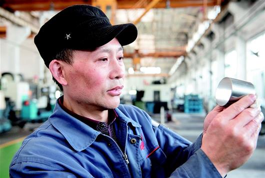 图为:魏红权正在查看研磨机械零件是否达到“镜面”精度。(记者 魏铼 摄)
