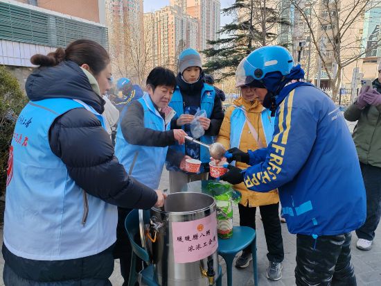 活动当天,地区总工会工作人员携手辖区内的青少年志愿者,精心筹备了腊八粥与暖心物资。他们前往清河营西路等户外劳动者较为集中的区域,为坚守岗位的快递员、外卖骑手、环卫工人递上热气腾腾的腊八粥。